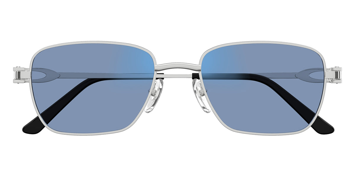 This square Cartier sunglass comes in a silver frame with clear blue control to dark grey photochromic lenses.