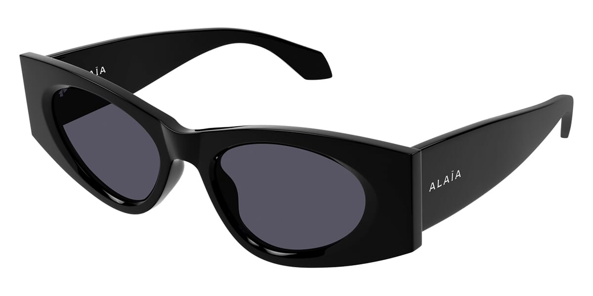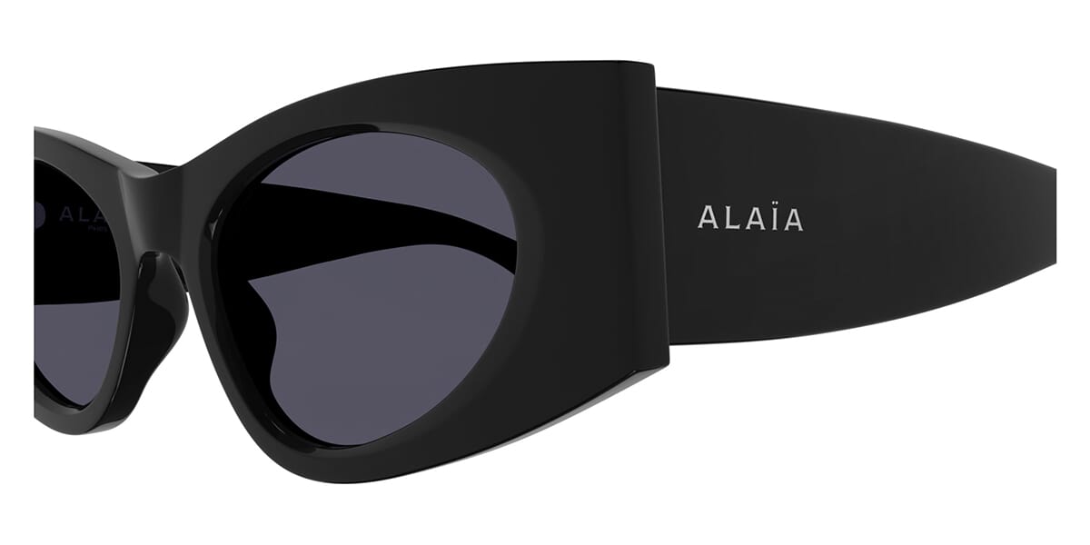 This cat eye Alaia sunglass comes in a shiny black frame with grey smoke lenses.