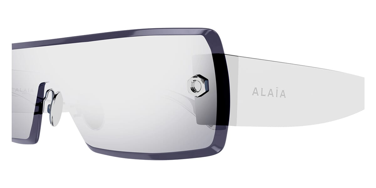 This shield Alaia sunglass comes in a shiny silver on matte silver frame with grey with silver mirror lenses.
