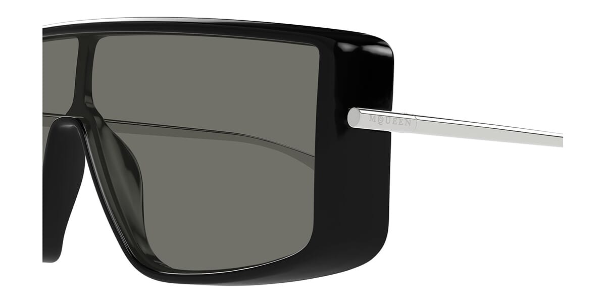This shield Alexander McQueen sunglass comes in a shiny black and silver frame with grey with light mirror lenses.