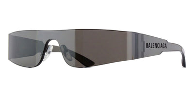 This shield Balenciaga sunglass comes in a grey crystal frame with grey lenses.