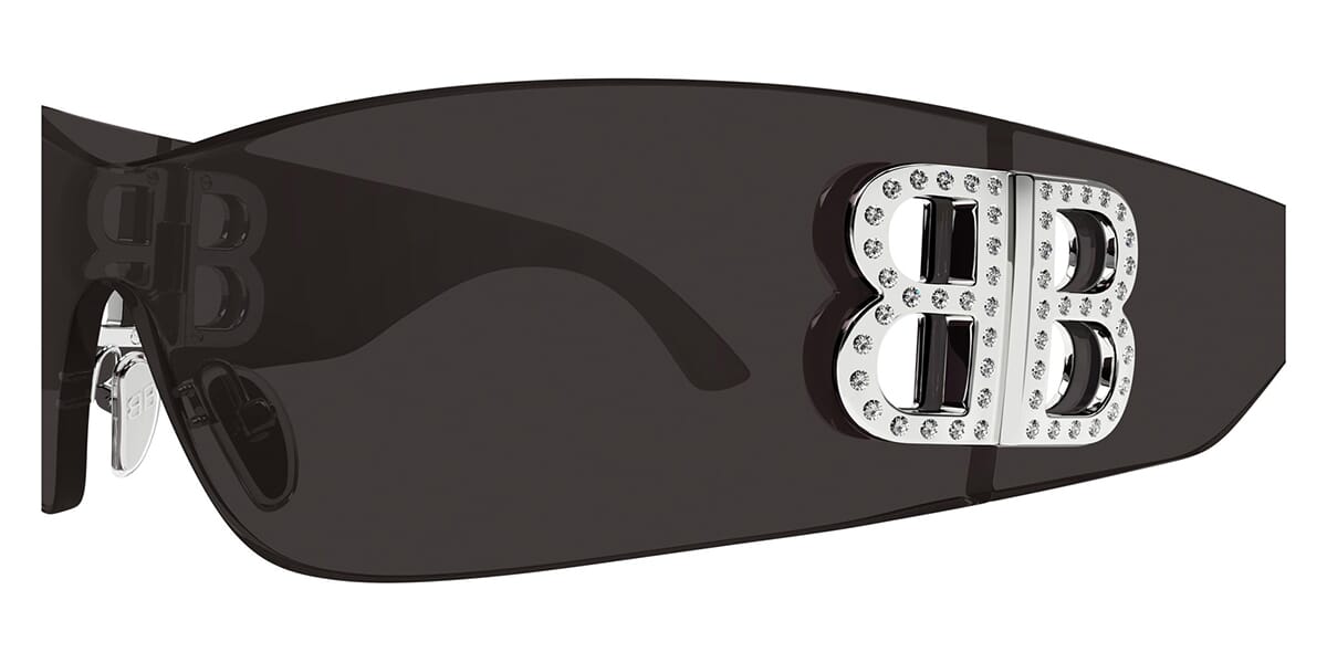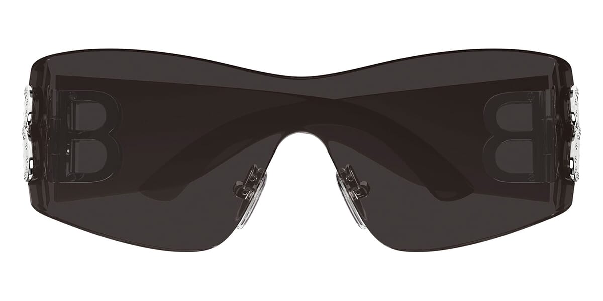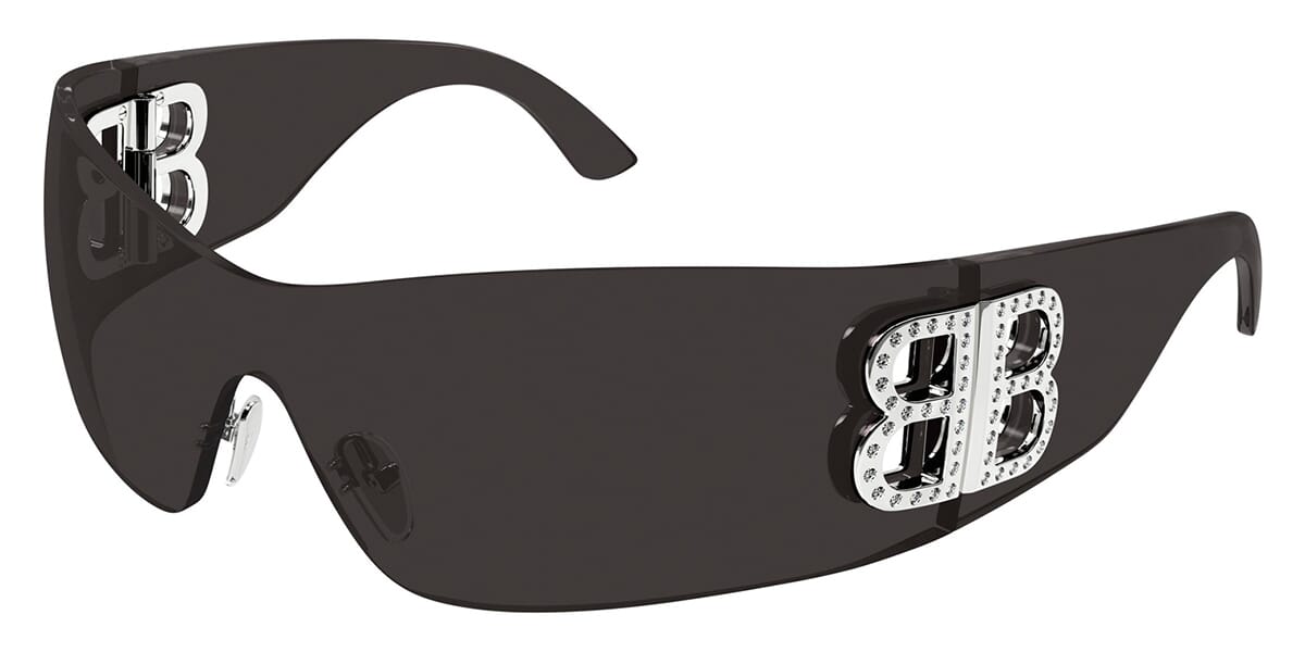 This wraparound Balenciaga sunglass comes in a crystal grey with crystal stud detail frame with grey lenses.