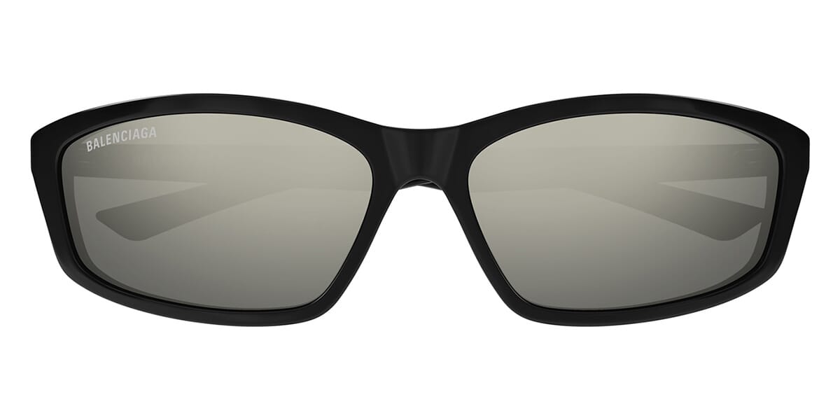 This square Balenciaga sunglass comes in a shiny black frame with grey with silver mirror lenses.
