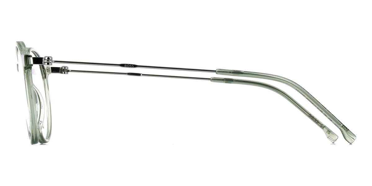 This round Hugo Boss optical comes in a green crystal and palladium frame.