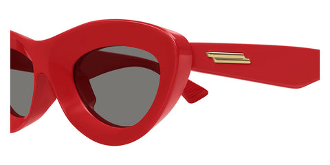 This cat eye Bottega Veneta sunglass comes in a shiny burgundy frame with grey with light mirror lenses.