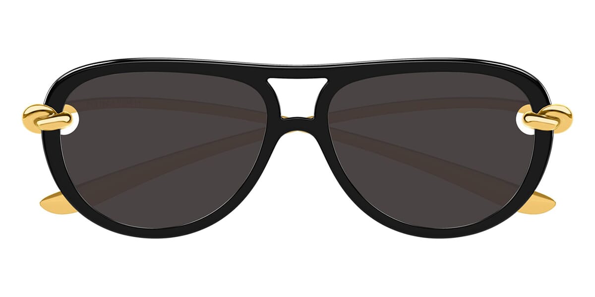 This square Bottega Veneta sunglass comes in a shiny black and gold frame with grey with light mirror lenses.
