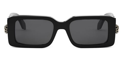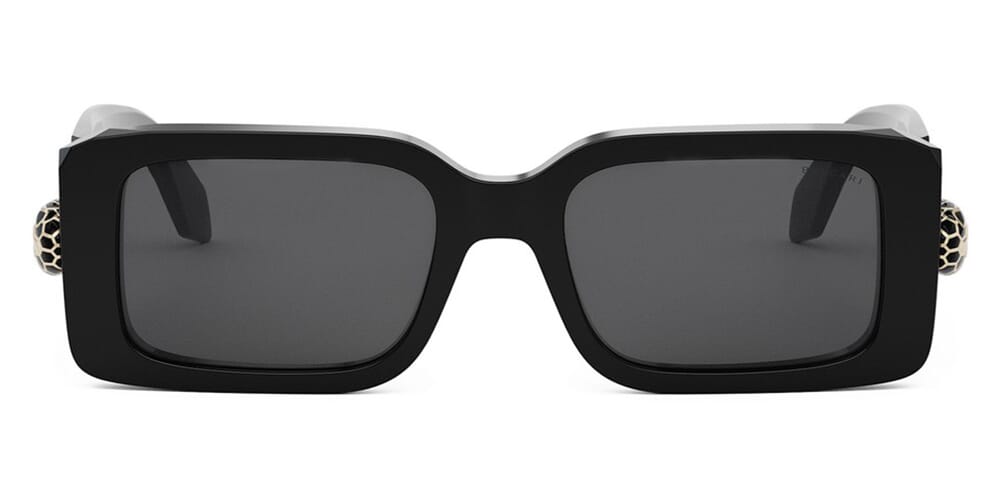This square BVLGARI sunglass comes in a shiny black frame with grey lenses.