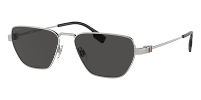 This square Burberry sunglass comes in a silver frame with light blue lenses.