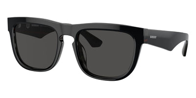 This square Burberry sunglass comes in a black on vintage check frame with dark grey polarised lenses.
