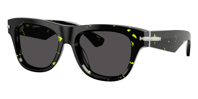 This square Burberry sunglass comes in a black frame with dark grey lenses.
