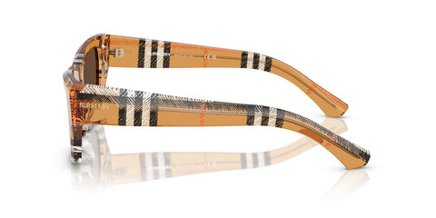 This cat eye Burberry sunglass comes in a check sand frame with dark brown lenses.