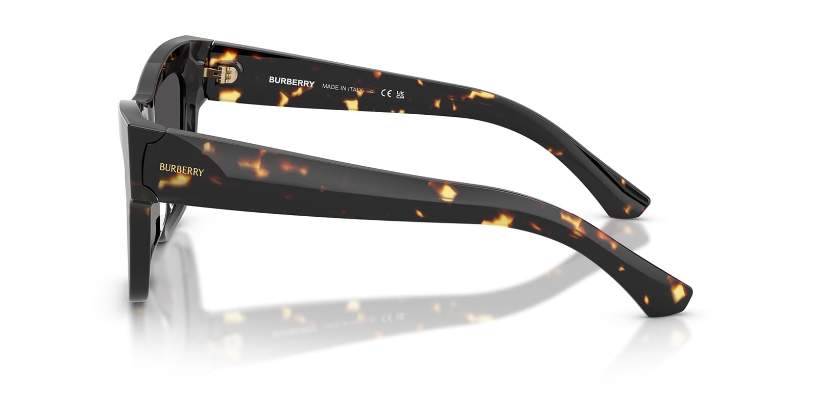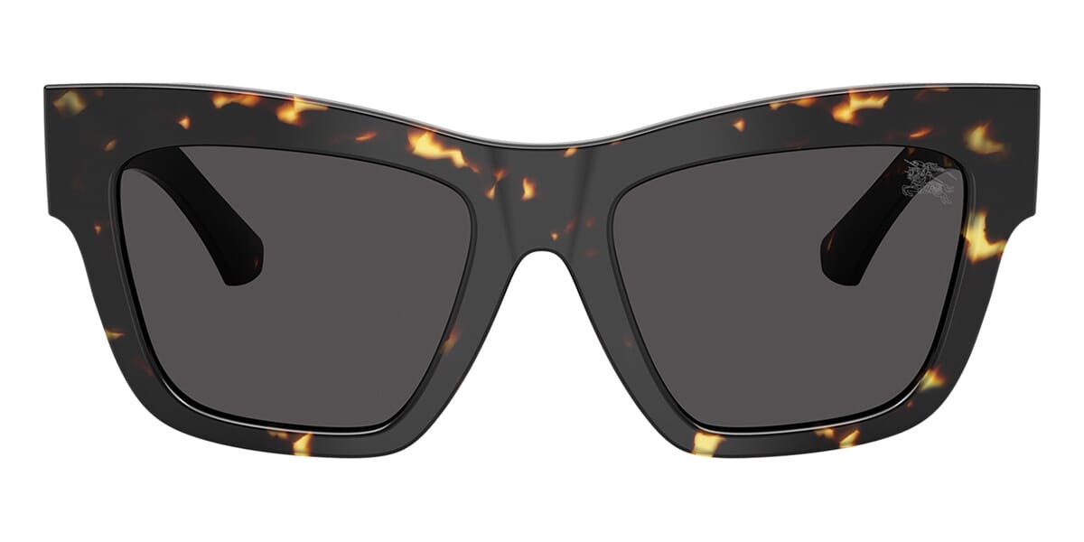 This square Burberry sunglass comes in a yellow havana frame with dark grey lenses.