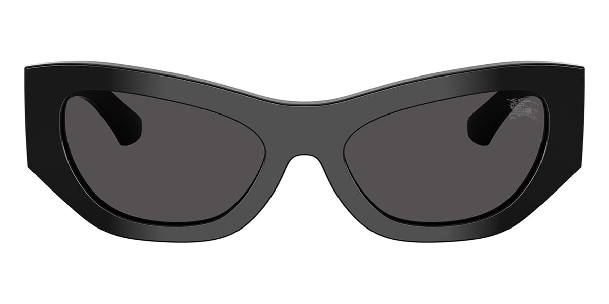 This cat eye Burberry sunglass comes in a black frame with dark grey lenses.