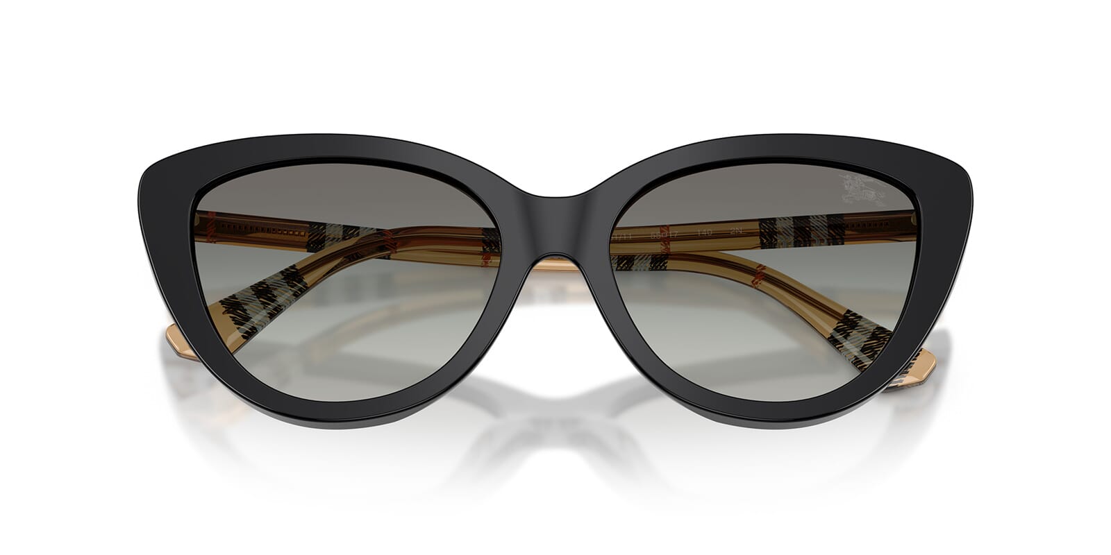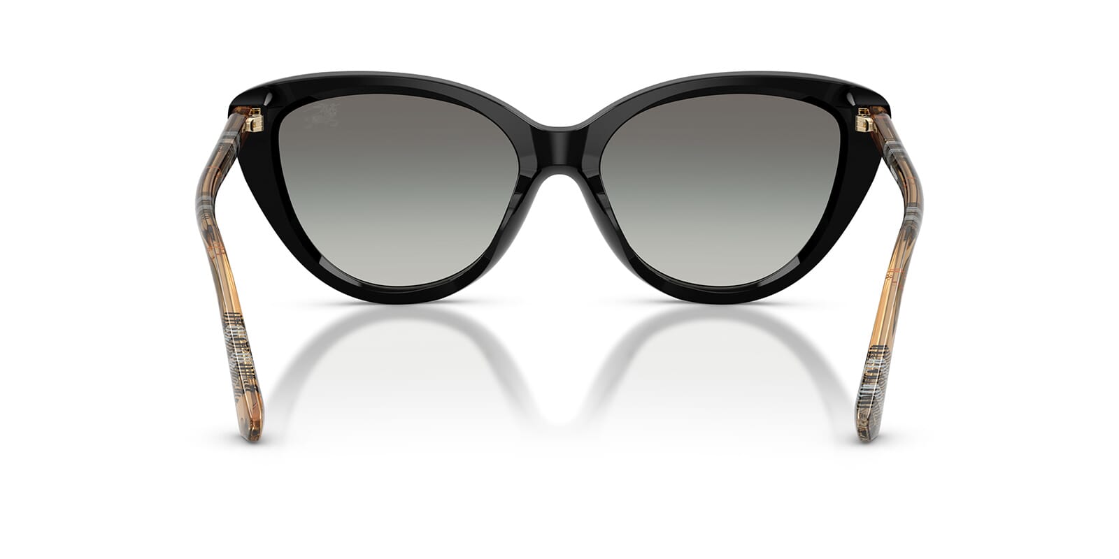 This cat eye Burberry sunglass comes in a black frame with grey gradient lenses.