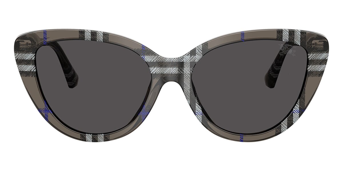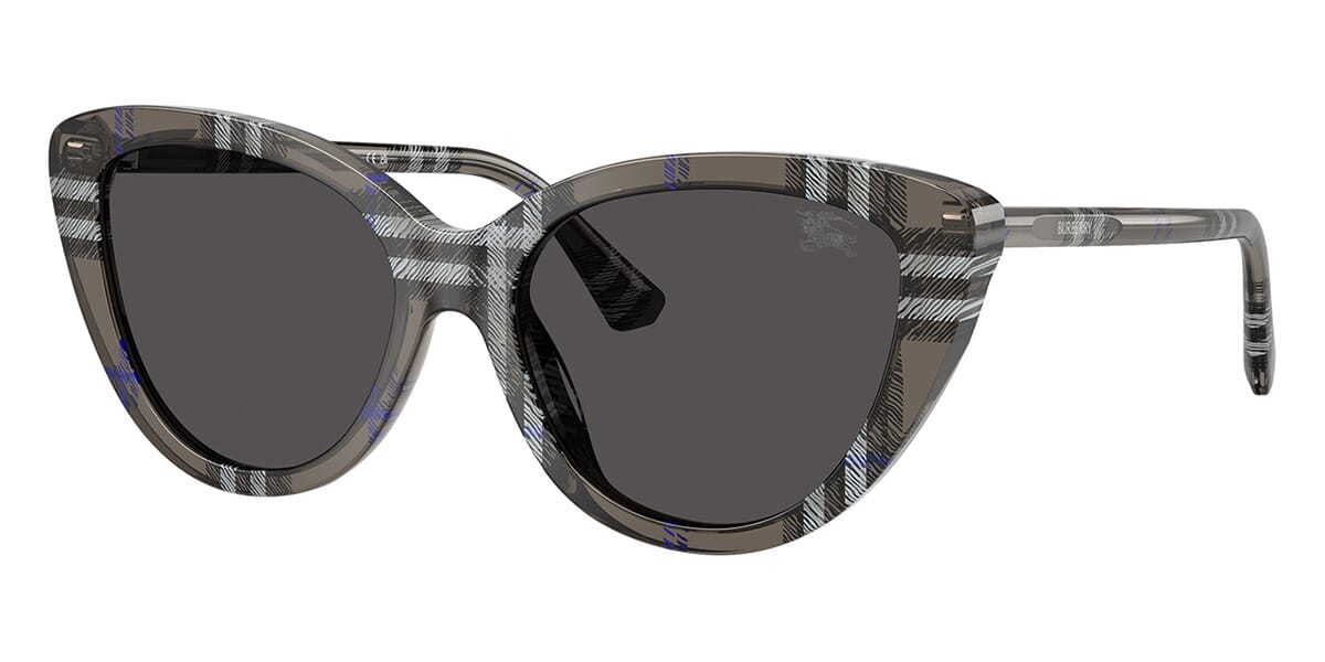 This cat eye Burberry sunglass comes in a check lichen frame with dark grey lenses.