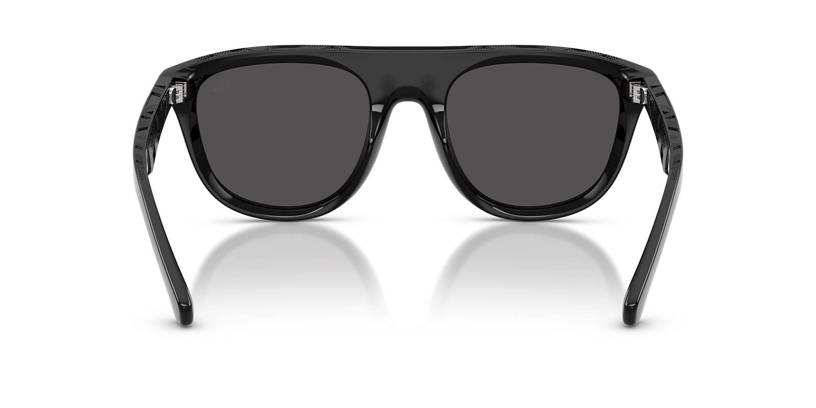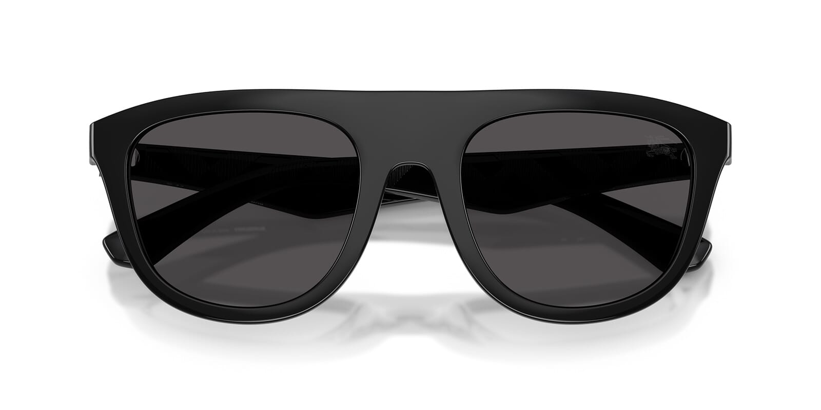This square Burberry sunglass comes in a black frame with dark grey lenses.