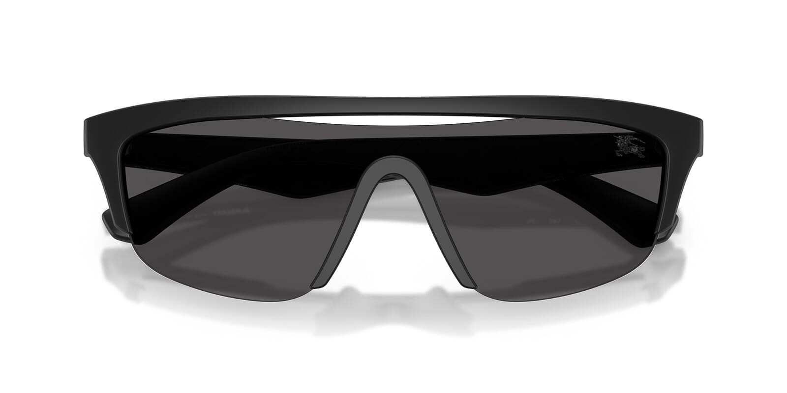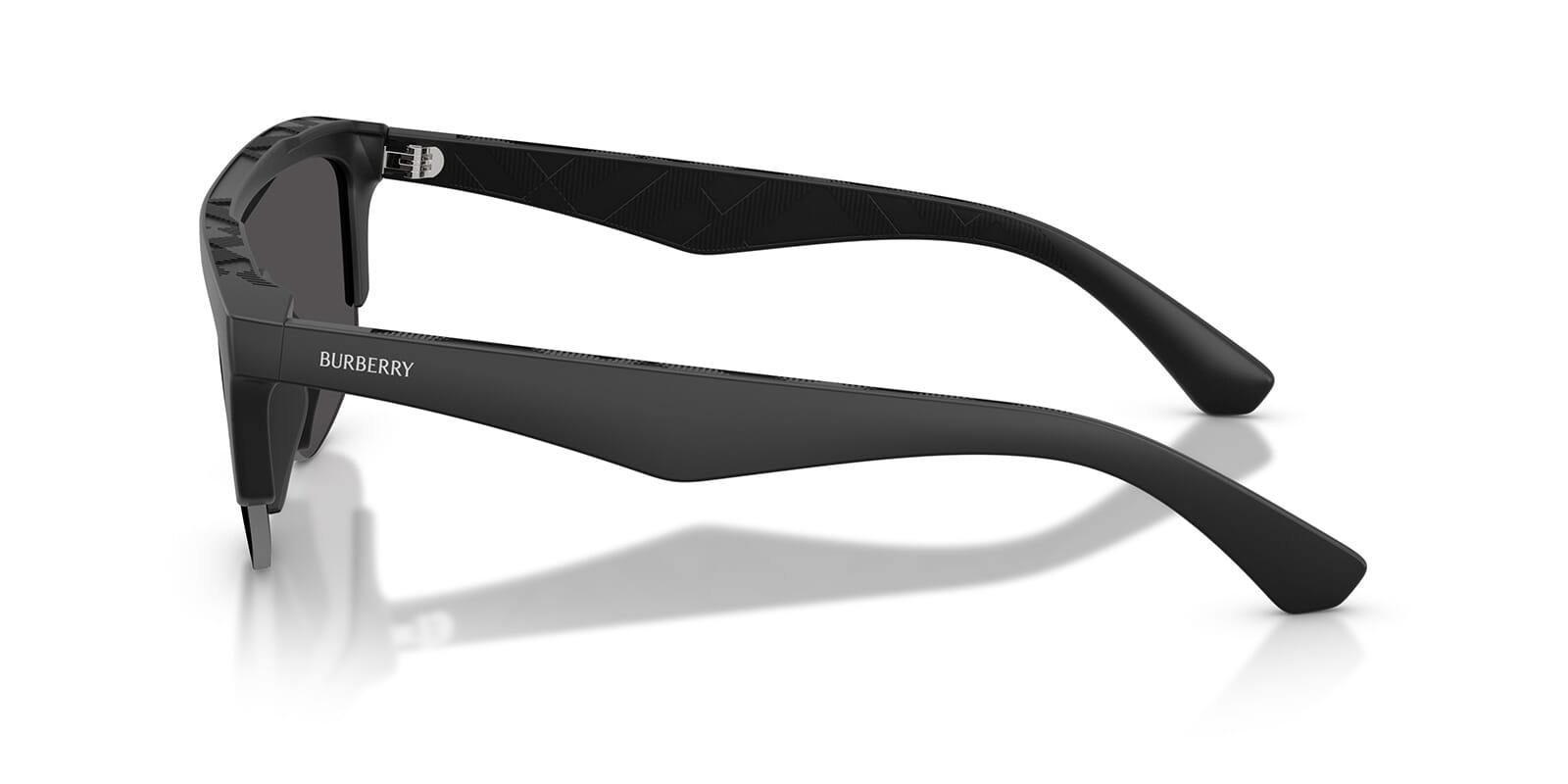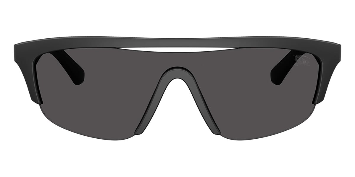 This rectangular Burberry sunglass comes in a matte black frame with dark grey lenses.