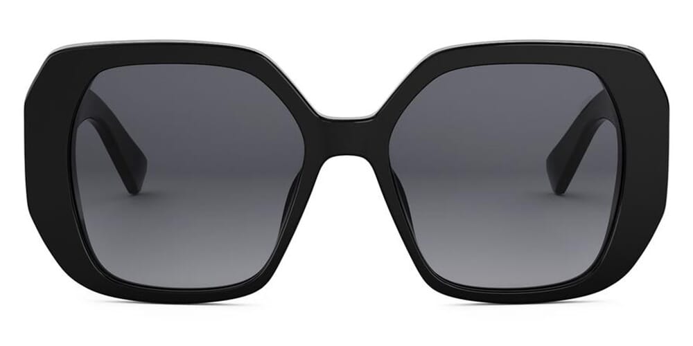 This square BVLGARI sunglass comes in a shiny black and gold frame with grey to clear gradient lenses.