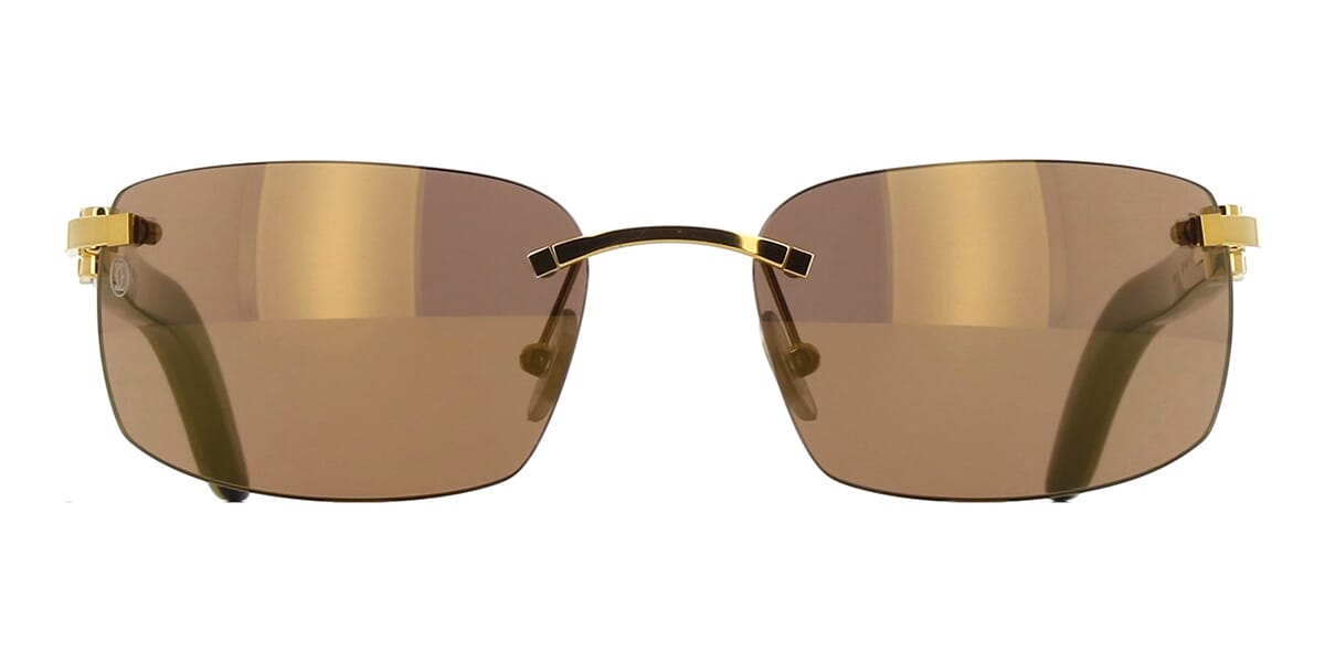 This square Cartier sunglass comes in a shiny gold with white genuine buffalo horn frame with brown with gold mirror lenses.