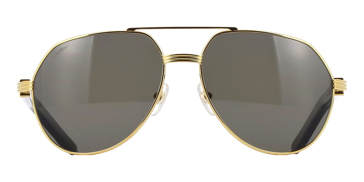 This aviator Cartier sunglass comes in a shiny gold with black genuine buffalo horn frame with grey with light mirror polarised lenses.