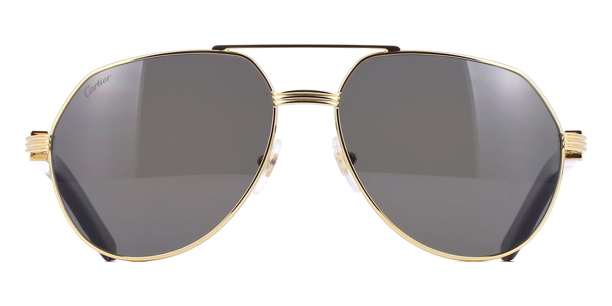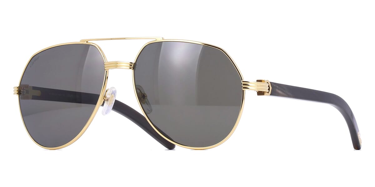This aviator Cartier sunglass comes in a shiny gold with genuine dark buffalo horn frame with grey polarised lenses.