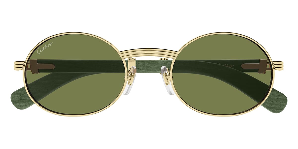This round Cartier sunglass comes in a gold and green real wood frame with green lenses.