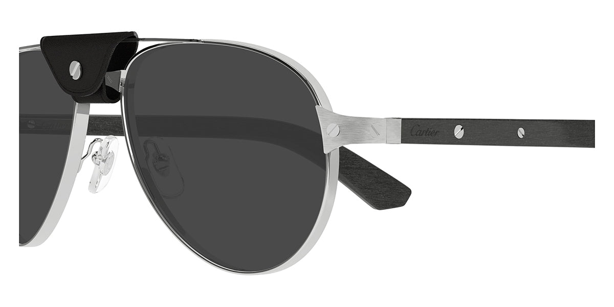 This aviator Cartier sunglass comes in a silver with black wood frame with grey smoke lenses.