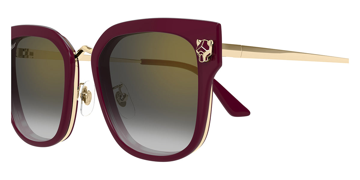 This square Cartier sunglass comes in a burgundy with gold frame with grey lenses.