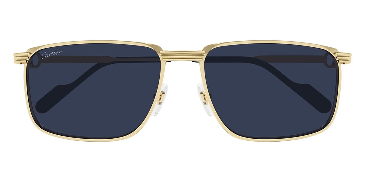 This square Cartier sunglass comes in a gold frame with blue lenses.