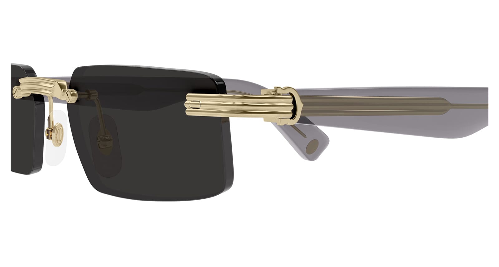 This square Cartier sunglass comes in a gold frame with grey lenses.