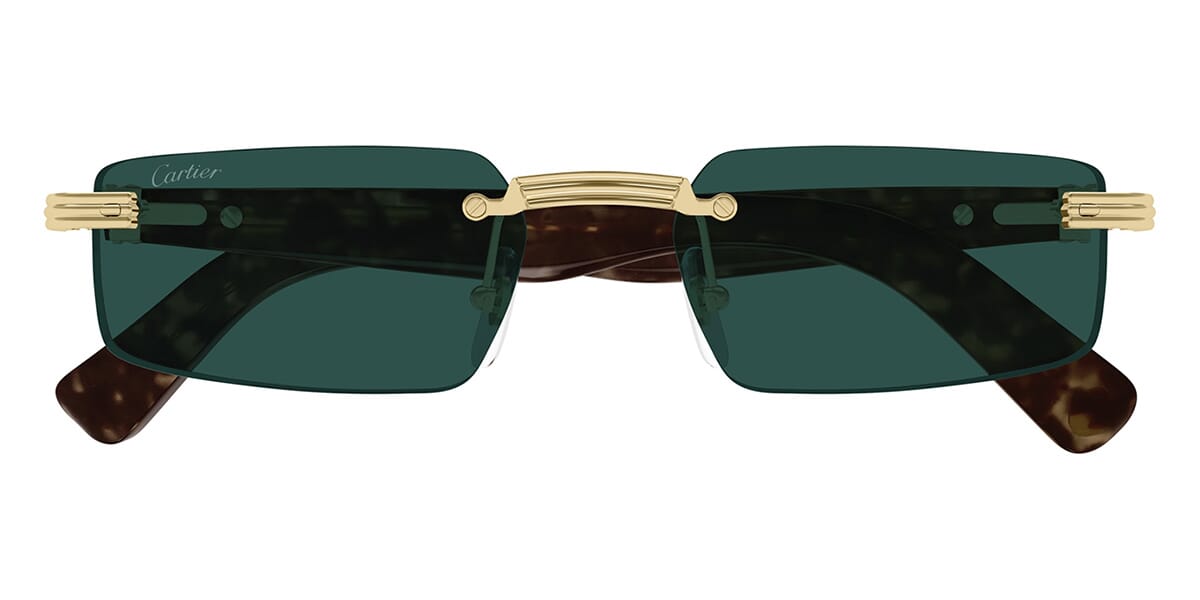 This square Cartier sunglass comes in a gold with havana frame with green lenses.