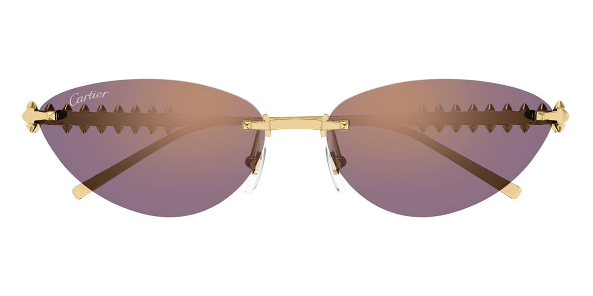 This cat eye Cartier sunglass comes in a shiny gold frame with violet with bronze mirror lenses.