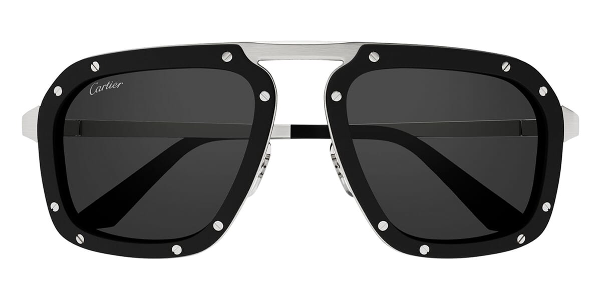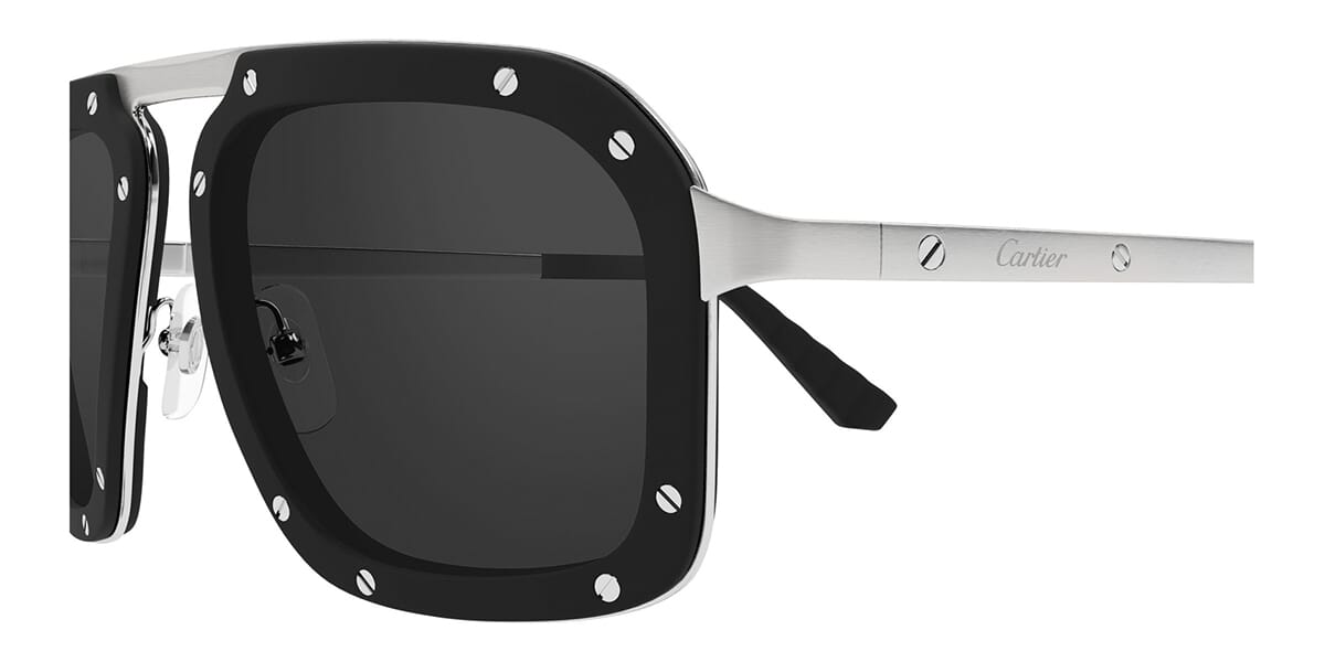 This square Cartier sunglass comes in a matte black and silver frame with grey smoke with light mirror polarised lenses.
