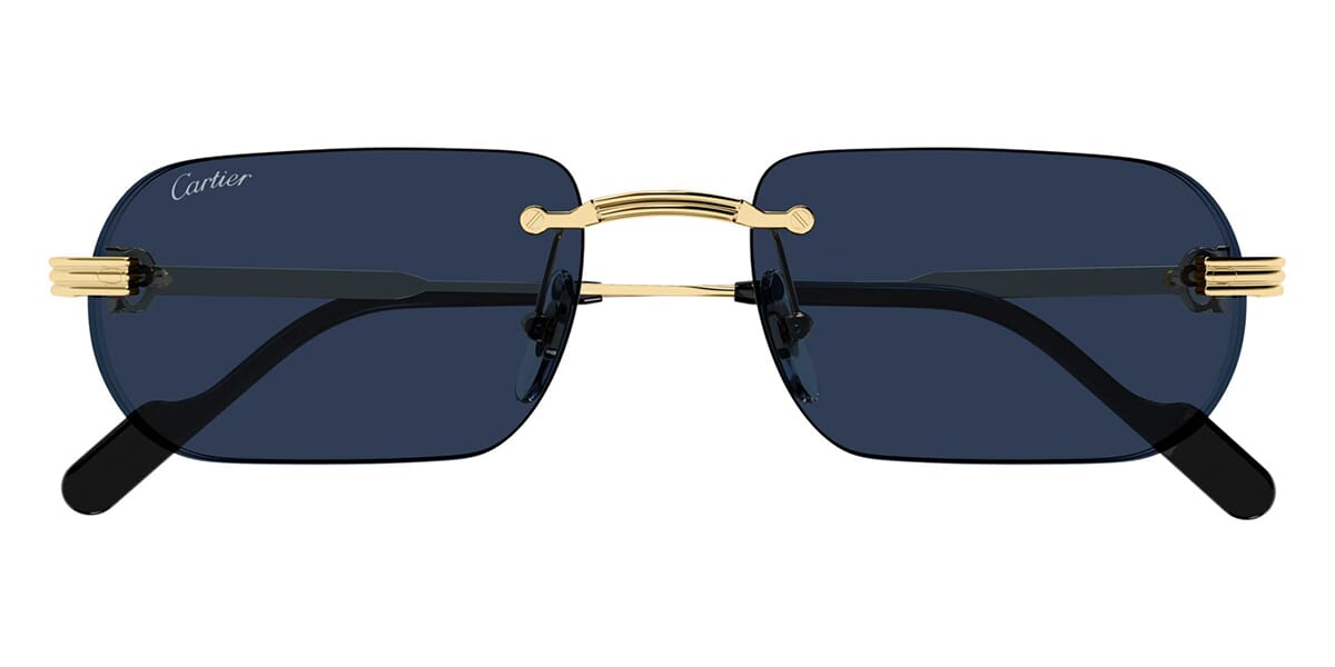 This square Cartier sunglass comes in a shiny gold frame with dark blue lenses.