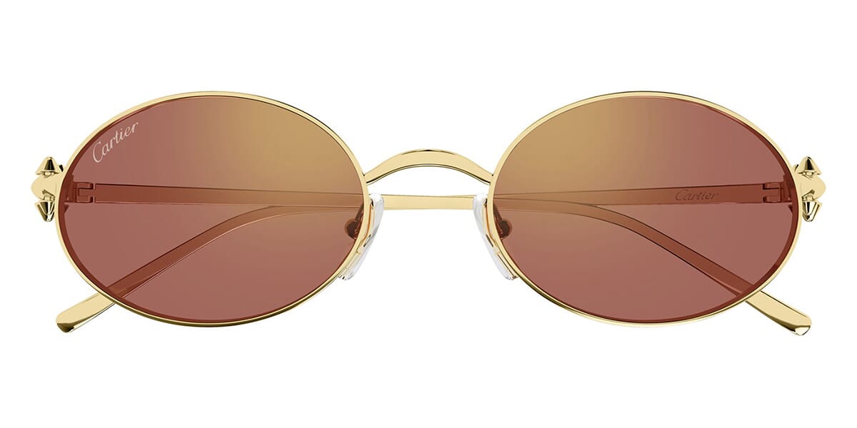 This round Cartier sunglass comes in a gold frame with red with gold flash mirror lenses.