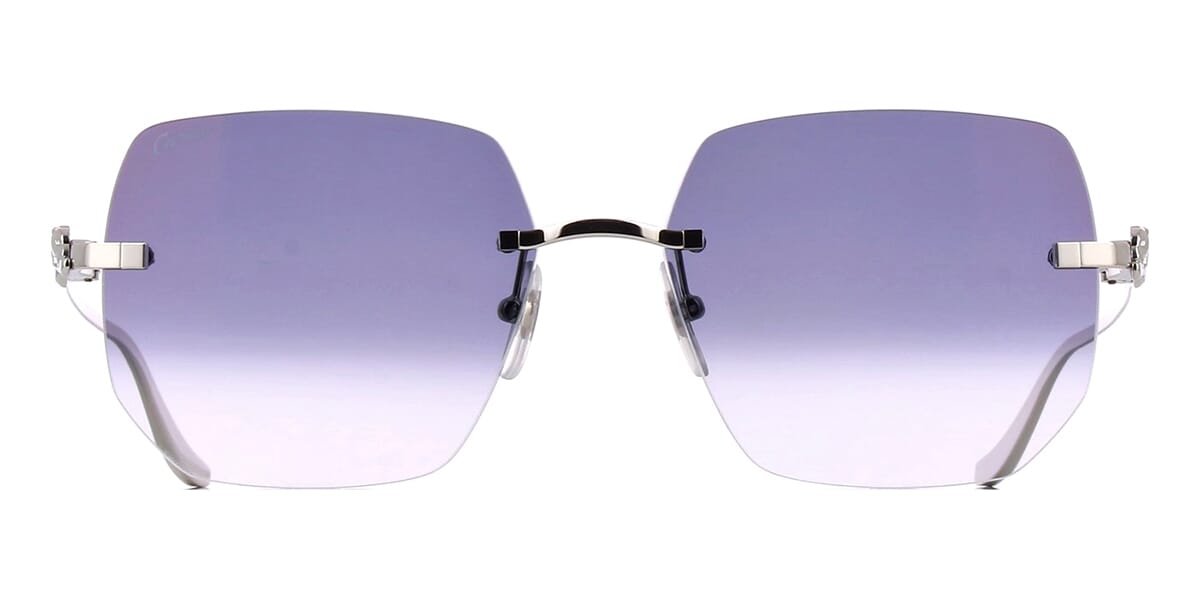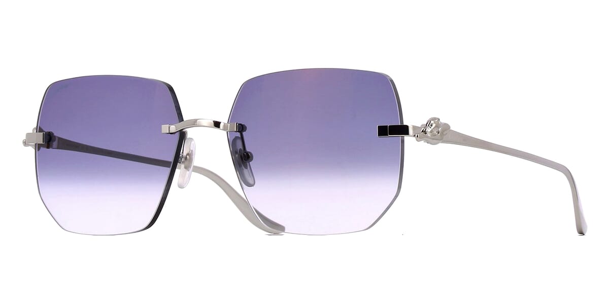 This square Cartier sunglass comes in a shiny silver frame with grey to clear gradient with gold mirror lenses.