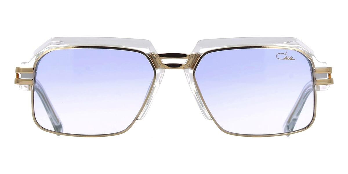 This square Cazal sunglass comes in a crystal clear and gold frame with blue to clear gradient lenses.