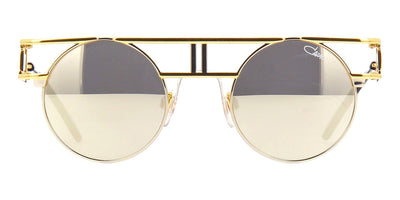 This round Cazal sunglass comes in a gold and black frame with grey lenses.