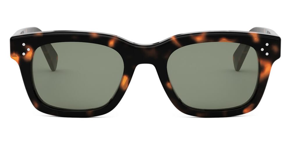 This square Celine sunglass comes in a shiny havana frame with green lenses.