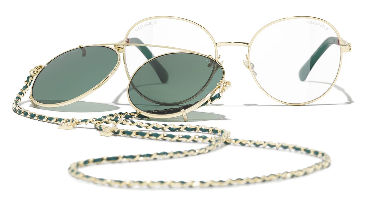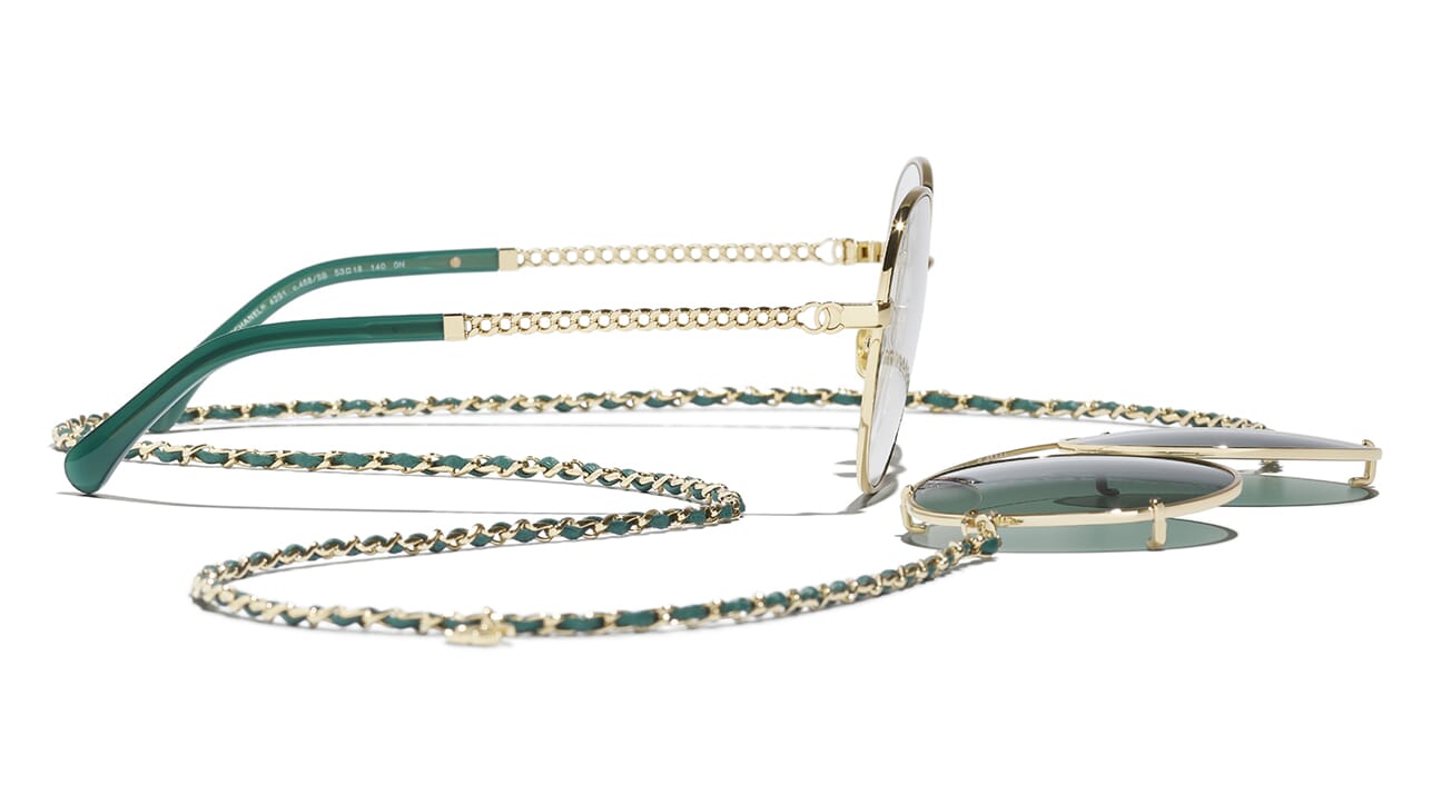 Pale Gold frame. Solid Green (clip on) with Clear blue-violet light filter lenses.