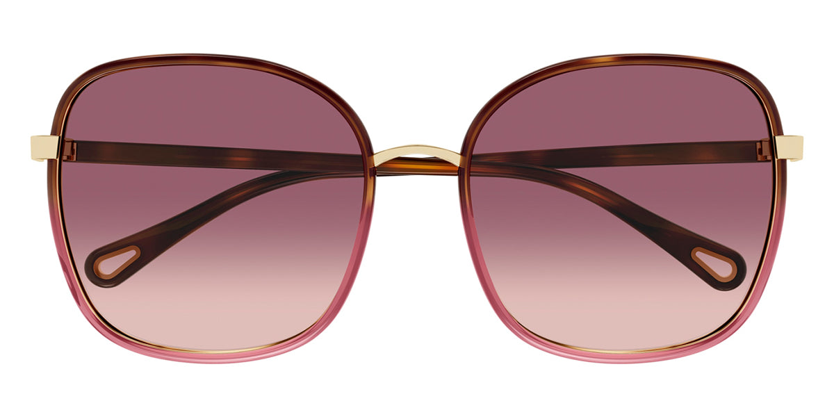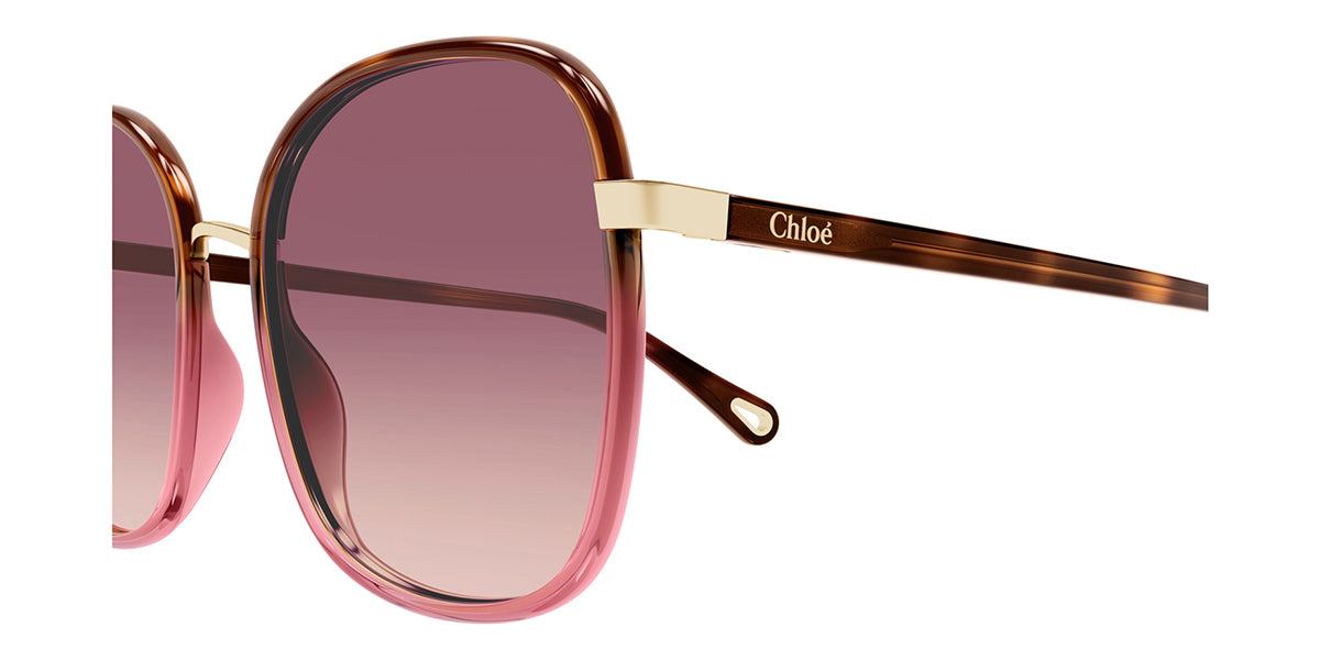 This square Chloe sunglass comes in a shiny havana to shiny crystal red gradient frame with red lenses.