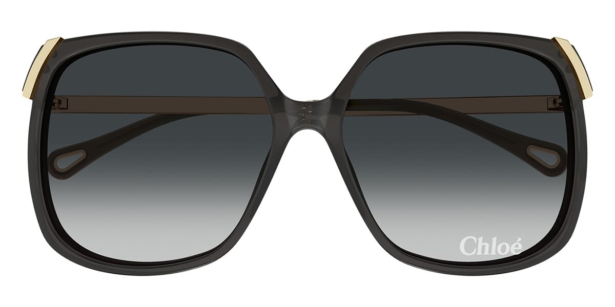 This square Chloe sunglass comes in a shiny crystal dark grey frame with grey lenses.