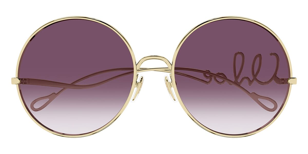 This round Chloe sunglass comes in a shiny gold frame with purple gradient lenses.
