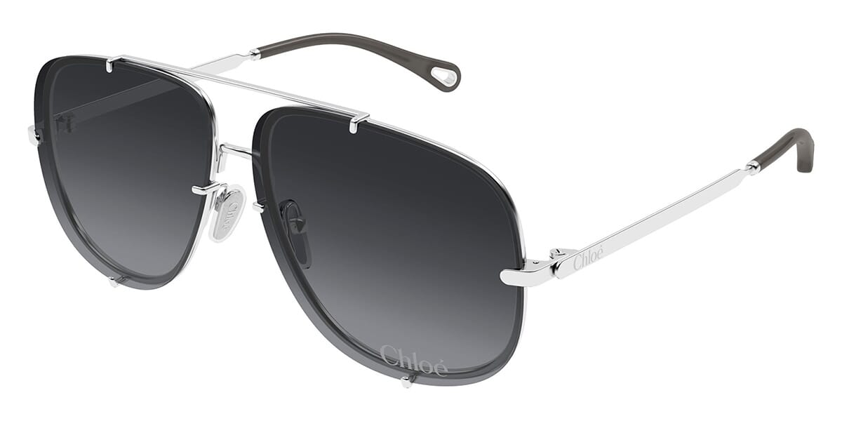 This square Chloe sunglass comes in a shiny silver frame with grey lenses.