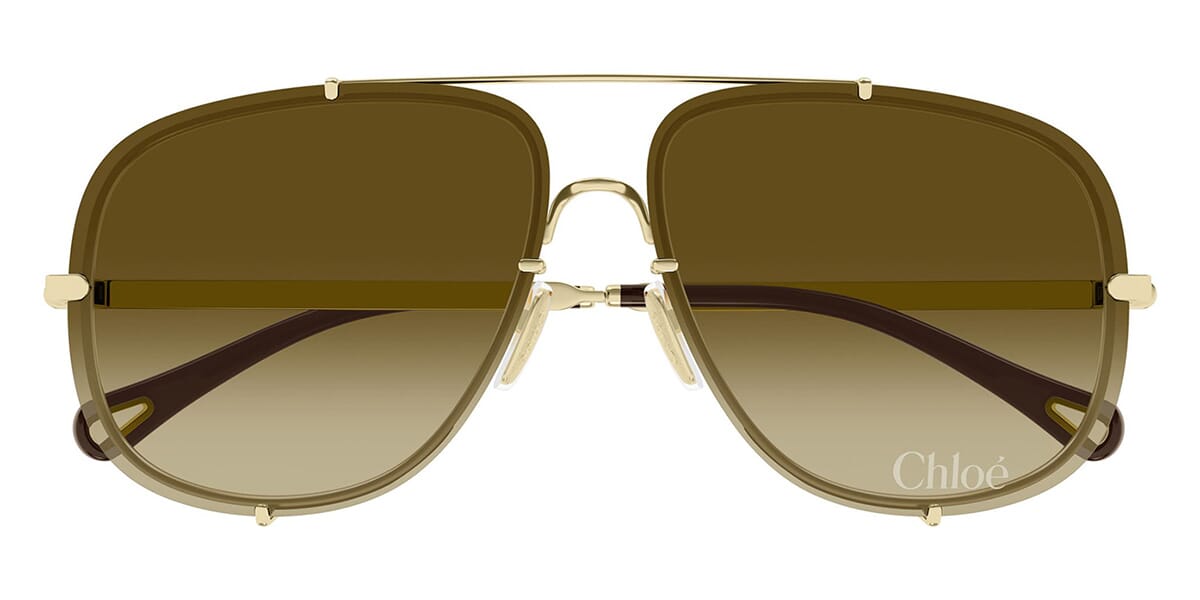 This square Chloe sunglass comes in a shiny gold frame with brown gradient lenses.