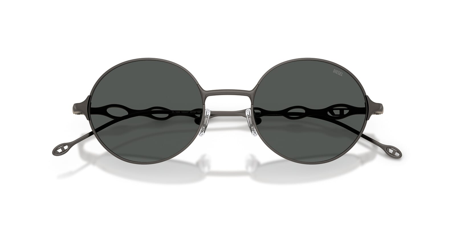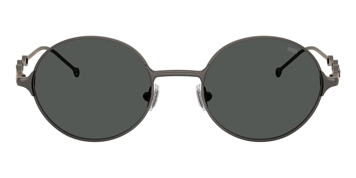 This round Diesel sunglass comes in a matte gunmetal frame with dark grey lenses.
