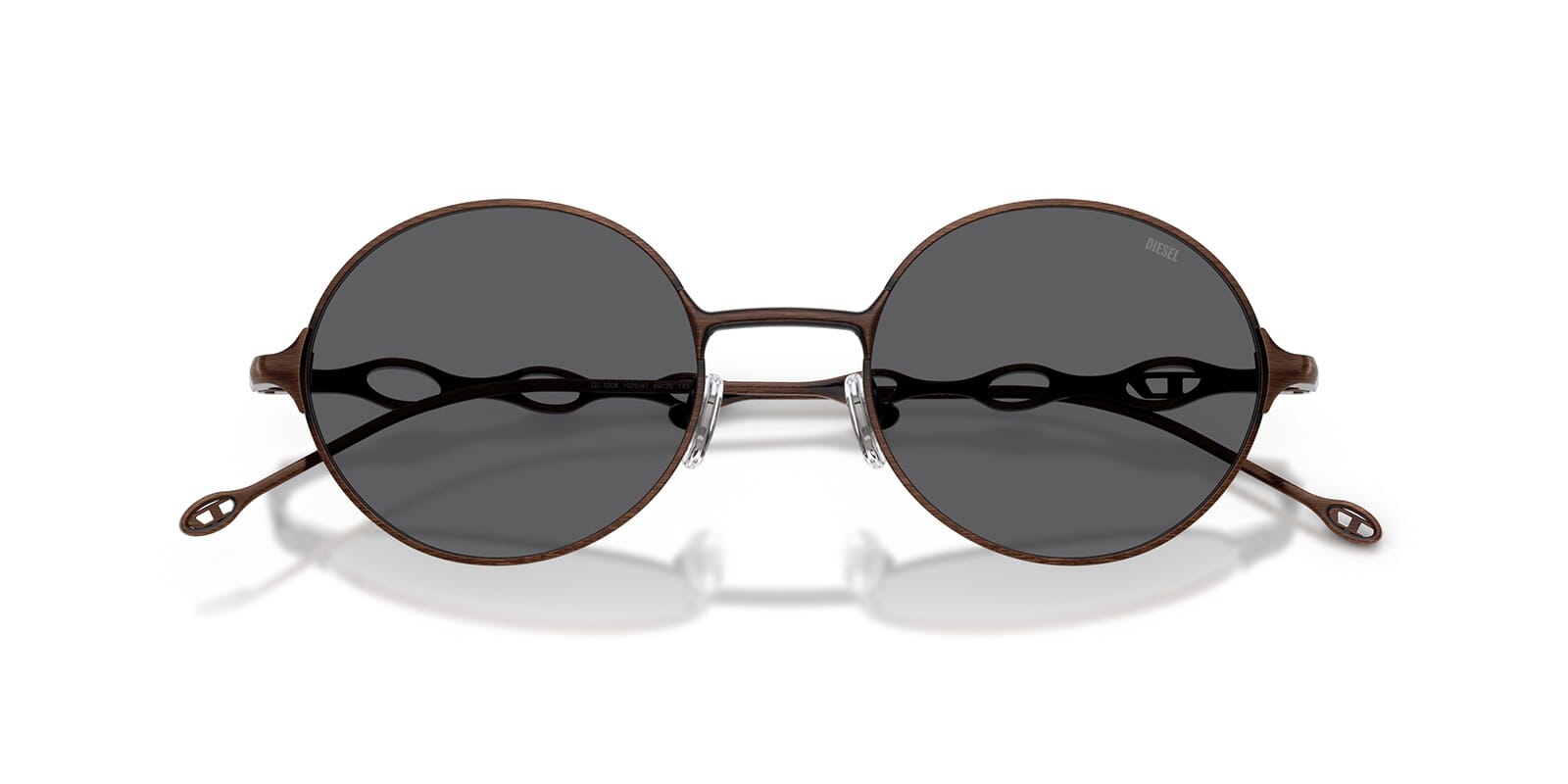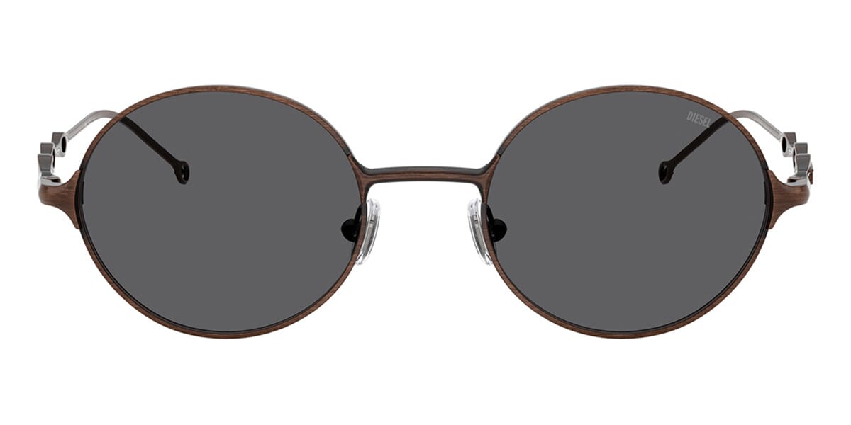 This round Diesel sunglass comes in a shiny brush light yellow brown frame with grey lenses.