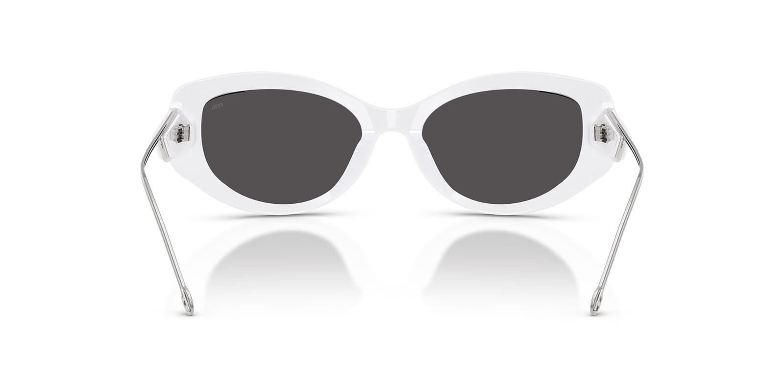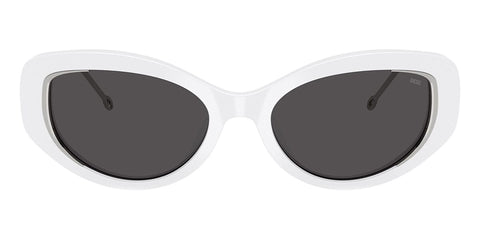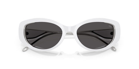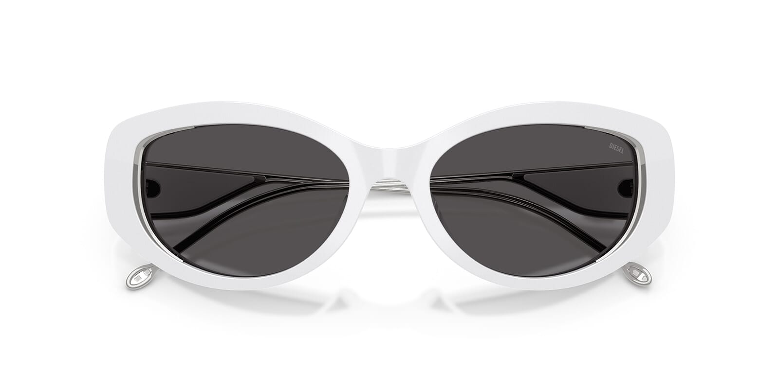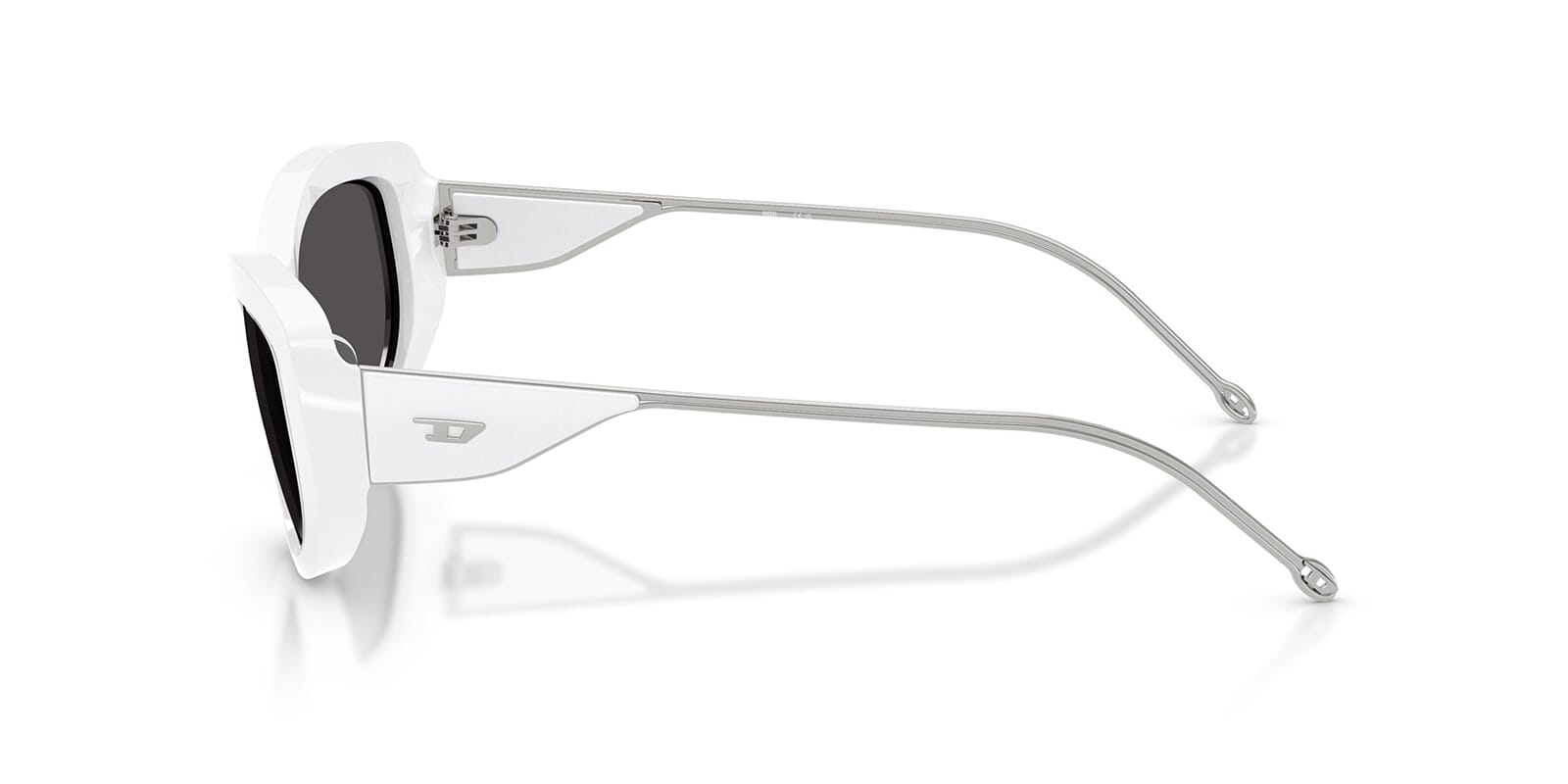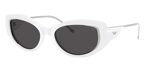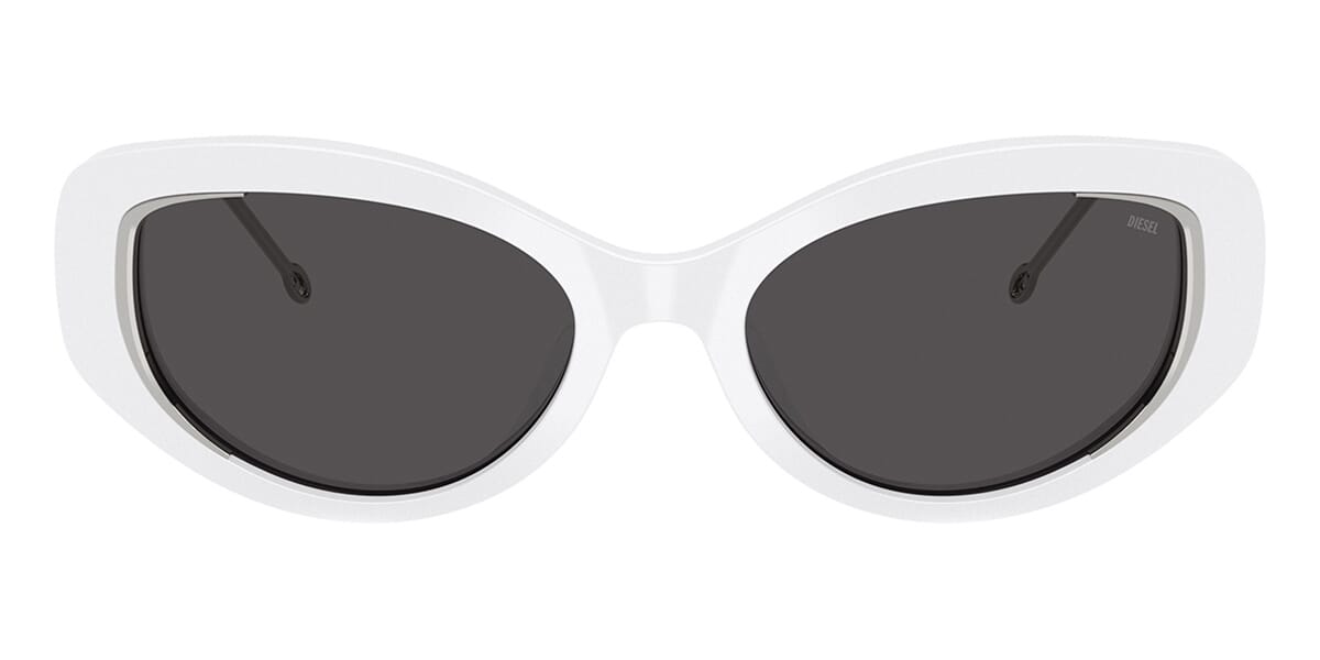 This round Diesel sunglass comes in a shiny white frame with dark grey lenses.