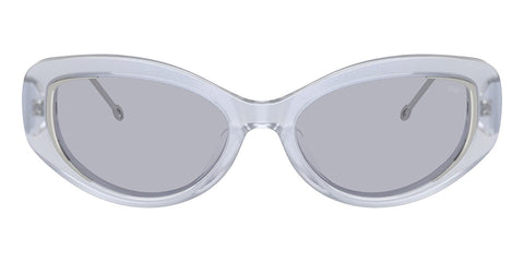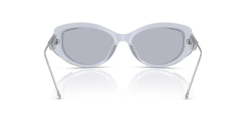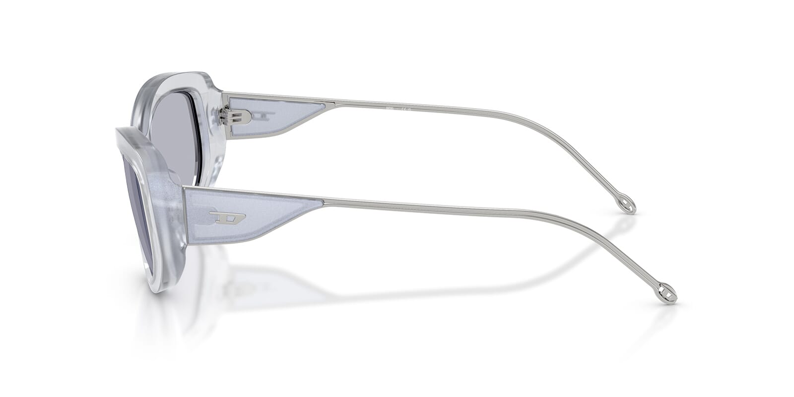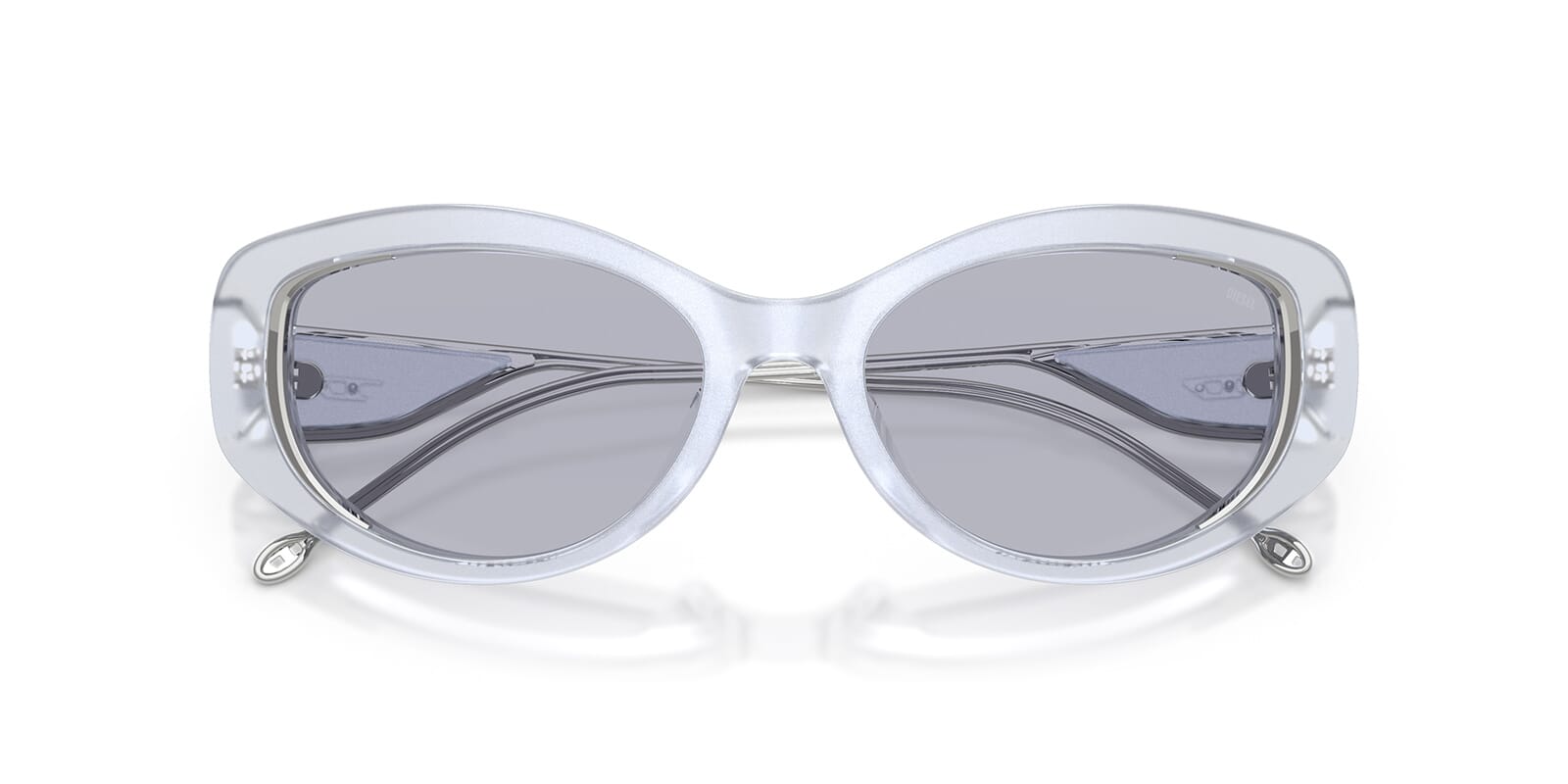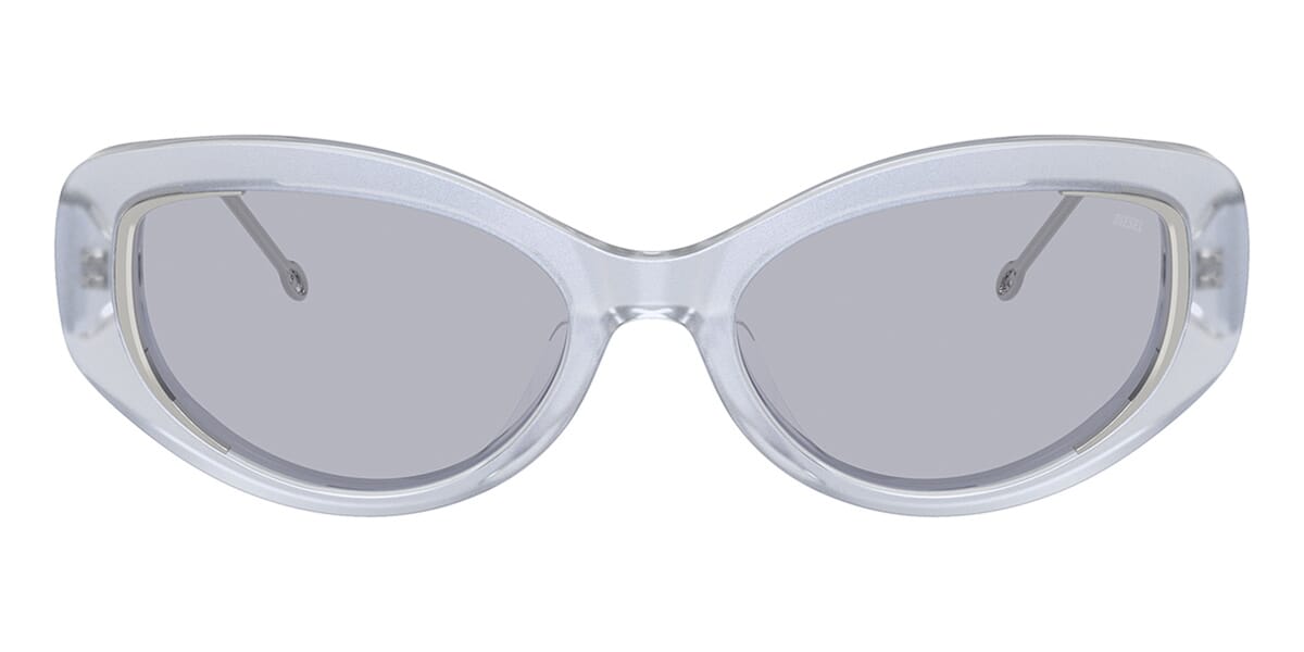 This round Diesel sunglass comes in a shiny iridescent crystal frame with violet lenses.