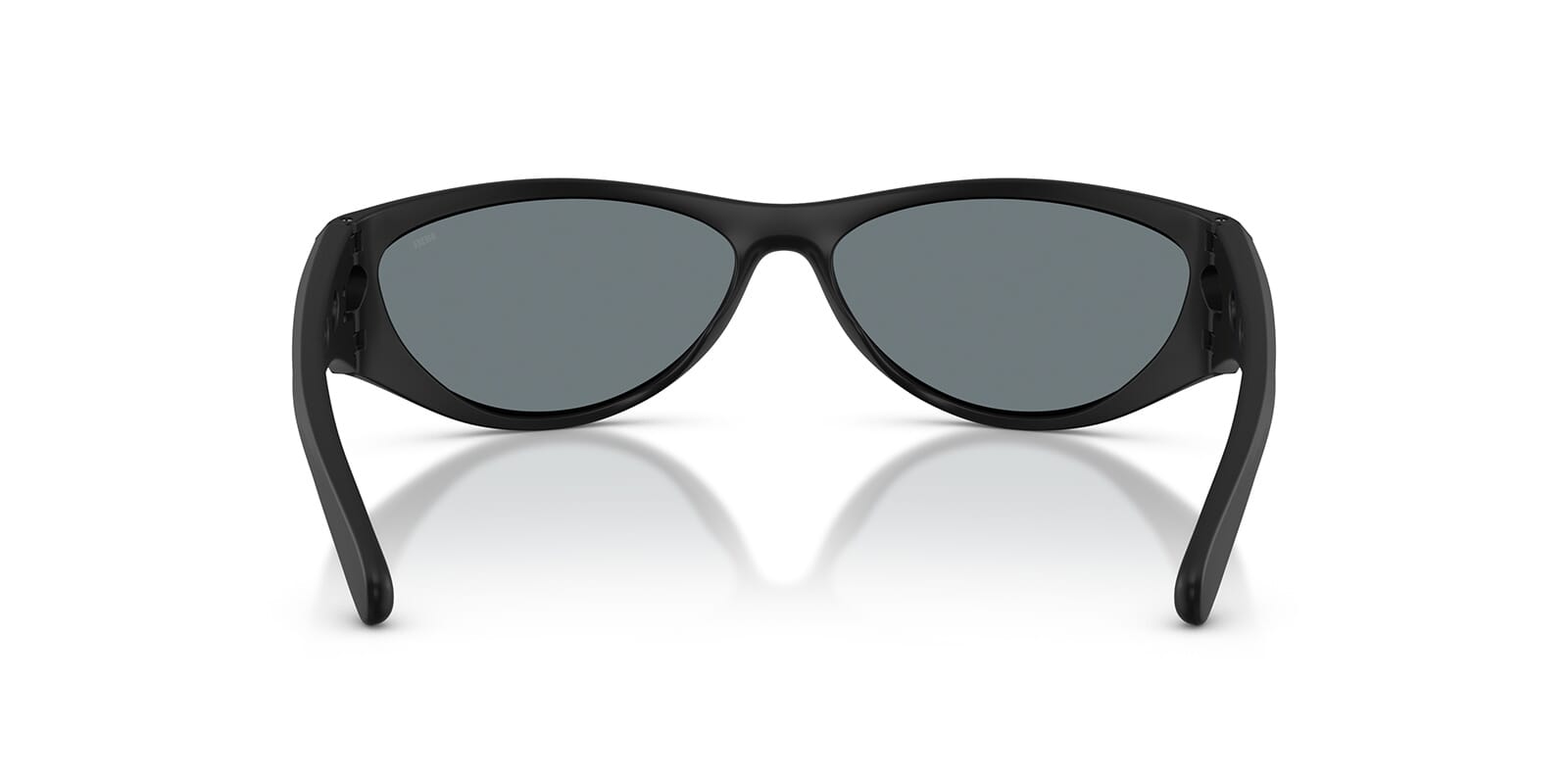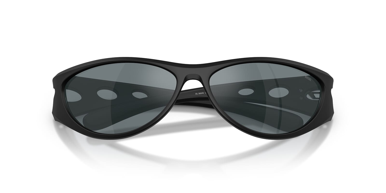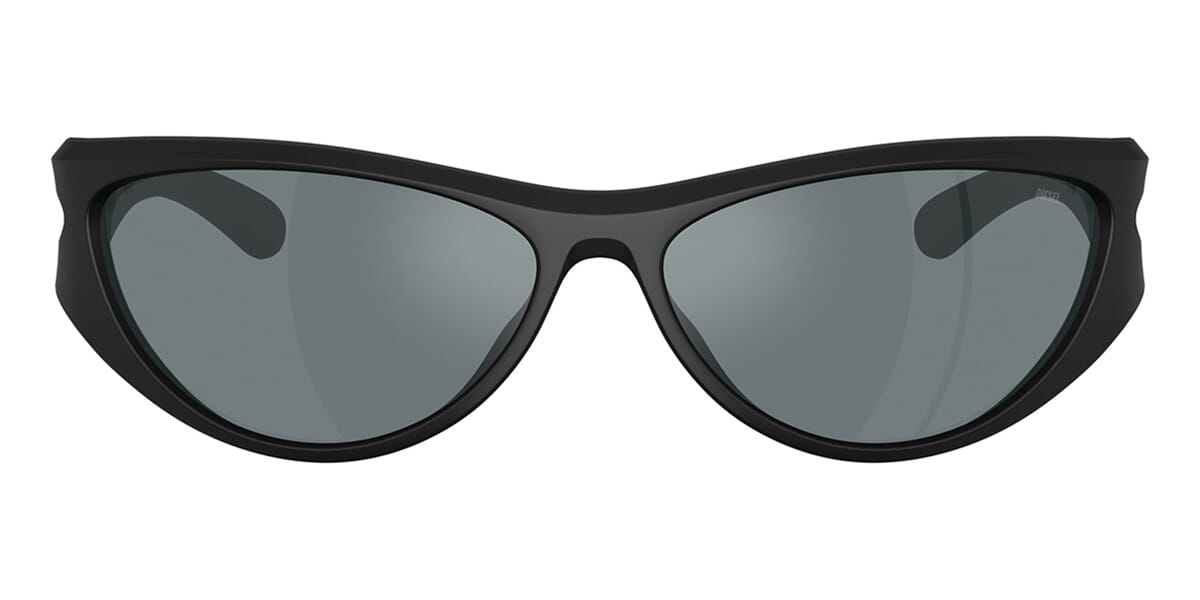 This cat eye Diesel sunglass comes in a matte black frame with grey with black mirror lenses.